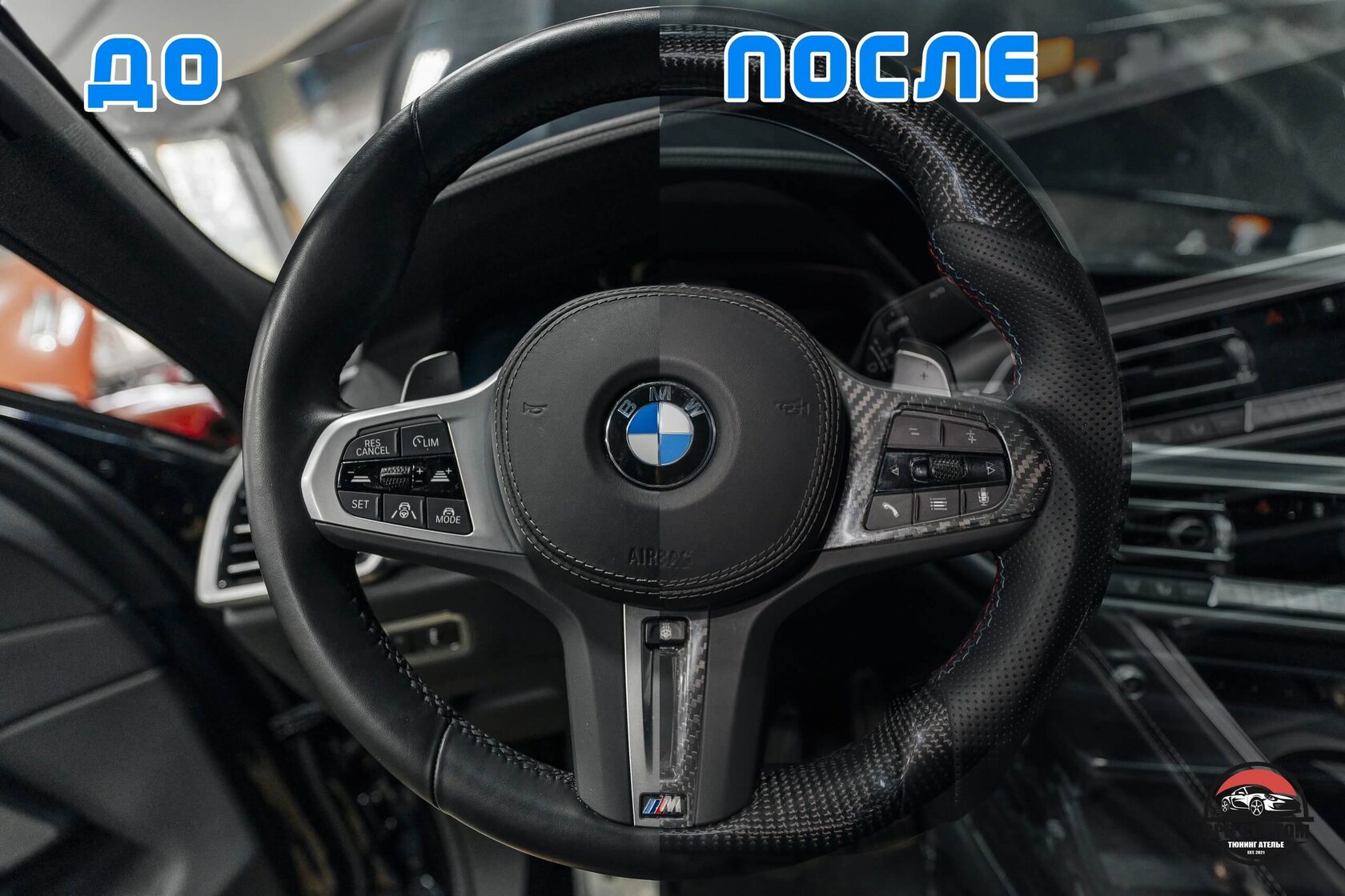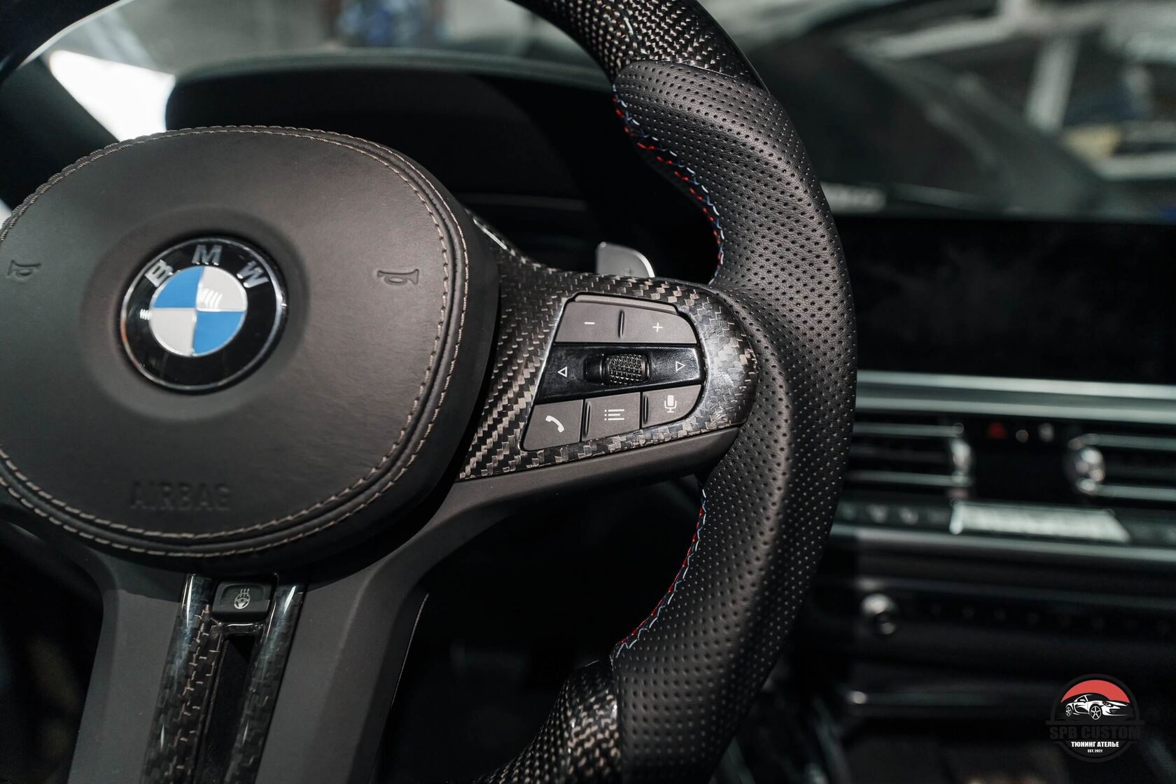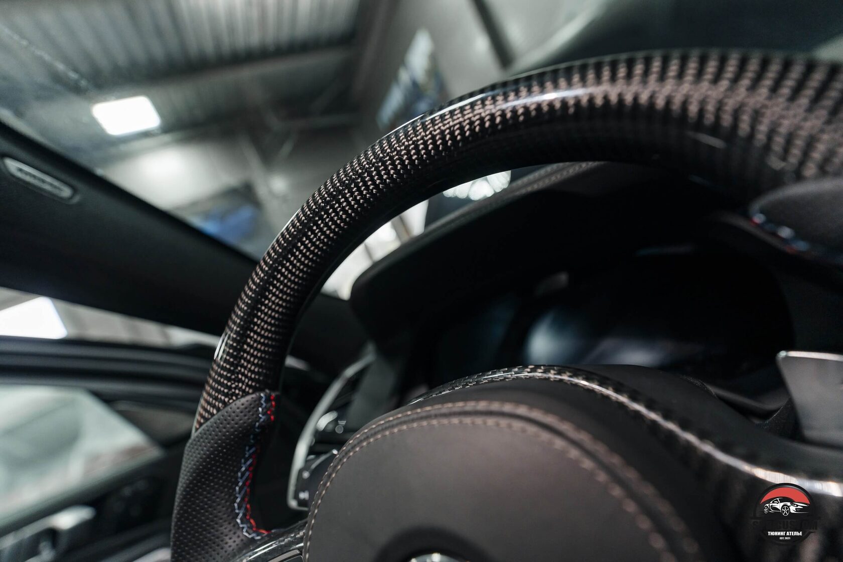Клиент захотел установить новый руль в карбоне и перфорации на коже, и комплект накладок B&W на динамики штатной аудиосистемы.